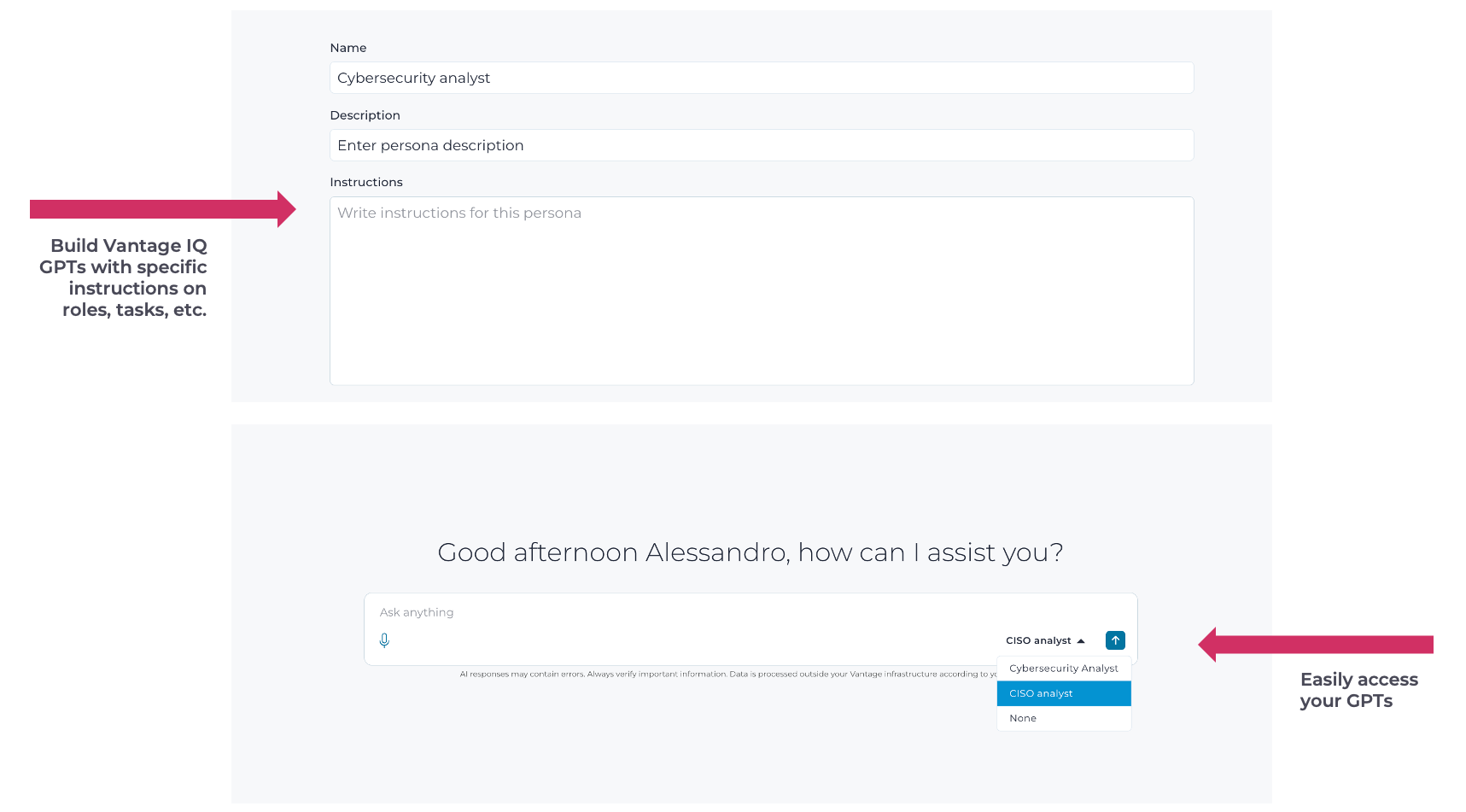 Vantage IQ Personas will allow users to define how AI responds based on their specific role and priorities. Custom personas can be configured to help you to generate reports, track compliance metrics, analyze alerts and so on. They can be tailored with specific instructions, preferred output formats, and more, so responses consistently align with role-specific language and workflows.