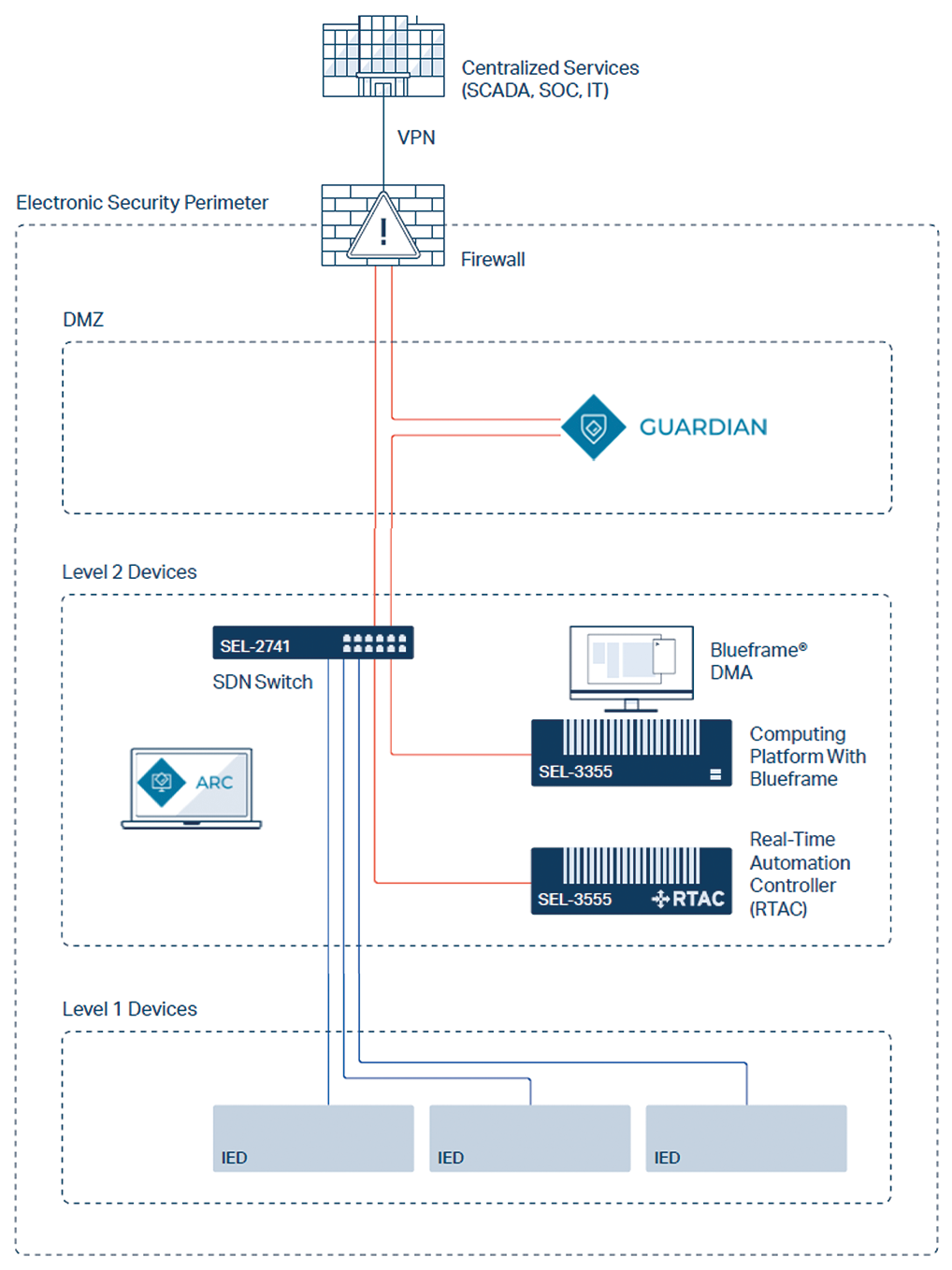 Simplified INSM network architecture using the Nozomi Networks platform with SEL Blueframe®