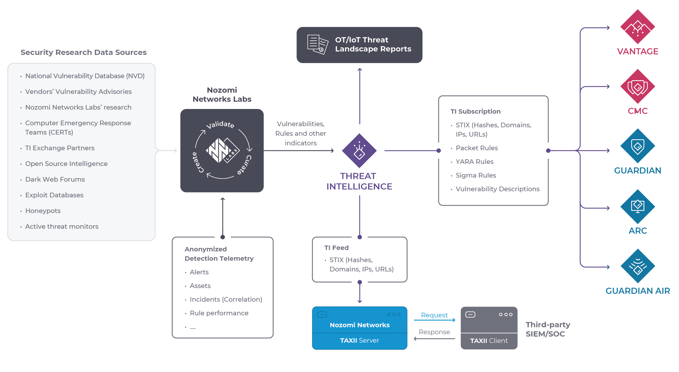 Detailed information on threat indicators including Yara rules, packet rules, STIX indicators, threat knowledgebase and vulnerability signatures.